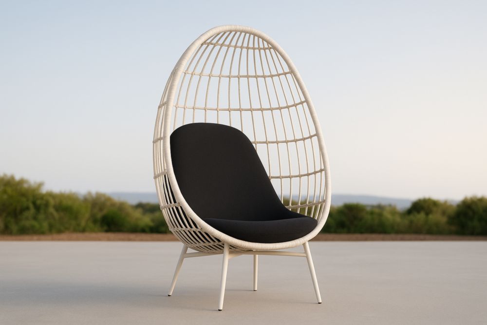 Fauteuil œuf extérieur rotin blanc coussin polyester noir